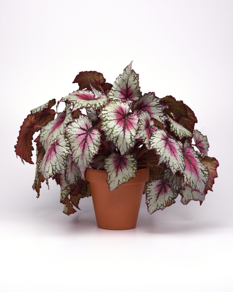 For gorgeous color in the shade, nothing beats a potted Begonia ‘Jurassic Pink Splash’. It can offer year-round beauty because the plant will winter over indoors. It does die back and lose some leaves, but when nighttime temperatures are above 50 degrees, return it to the semi-shade garden to flourish another season.